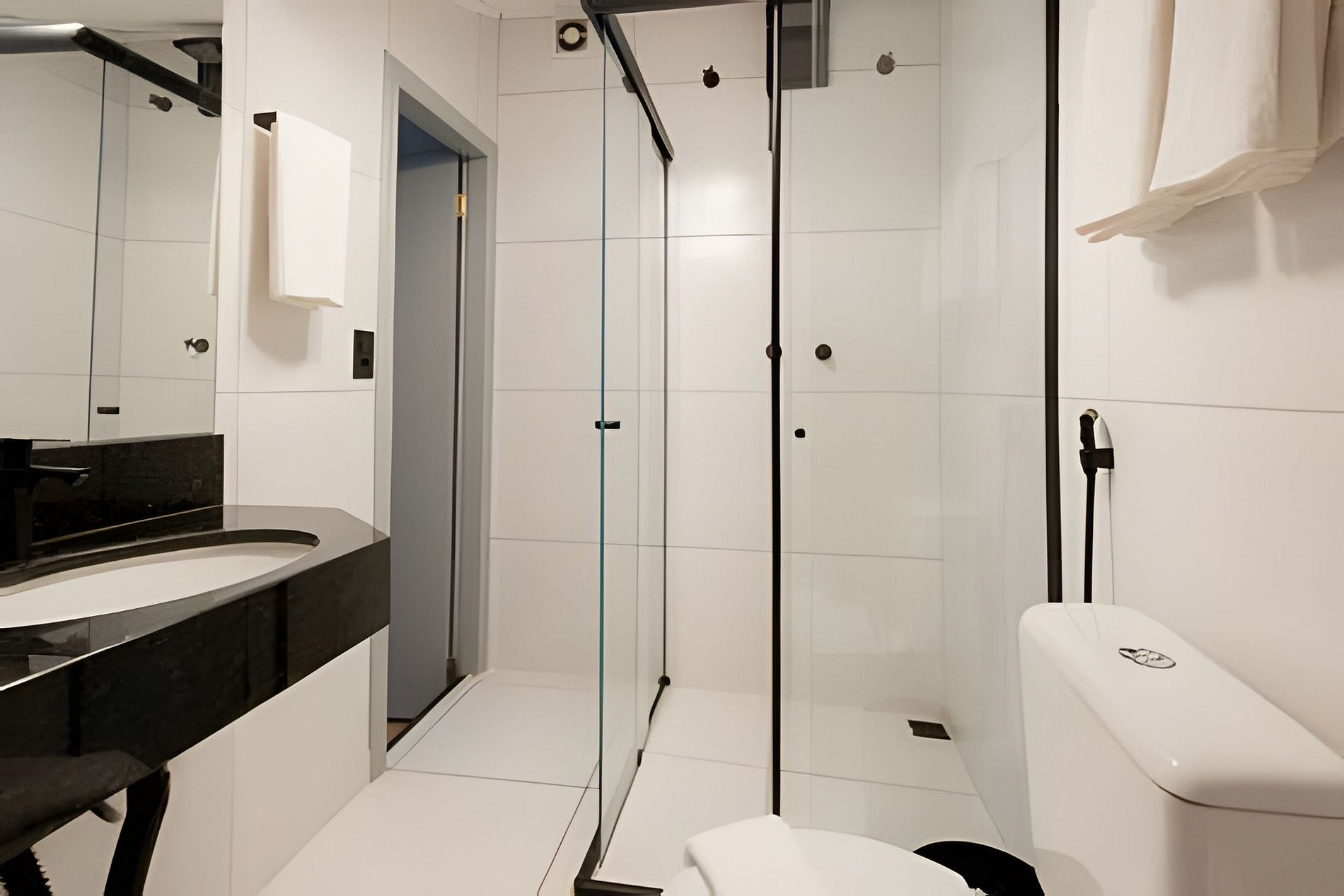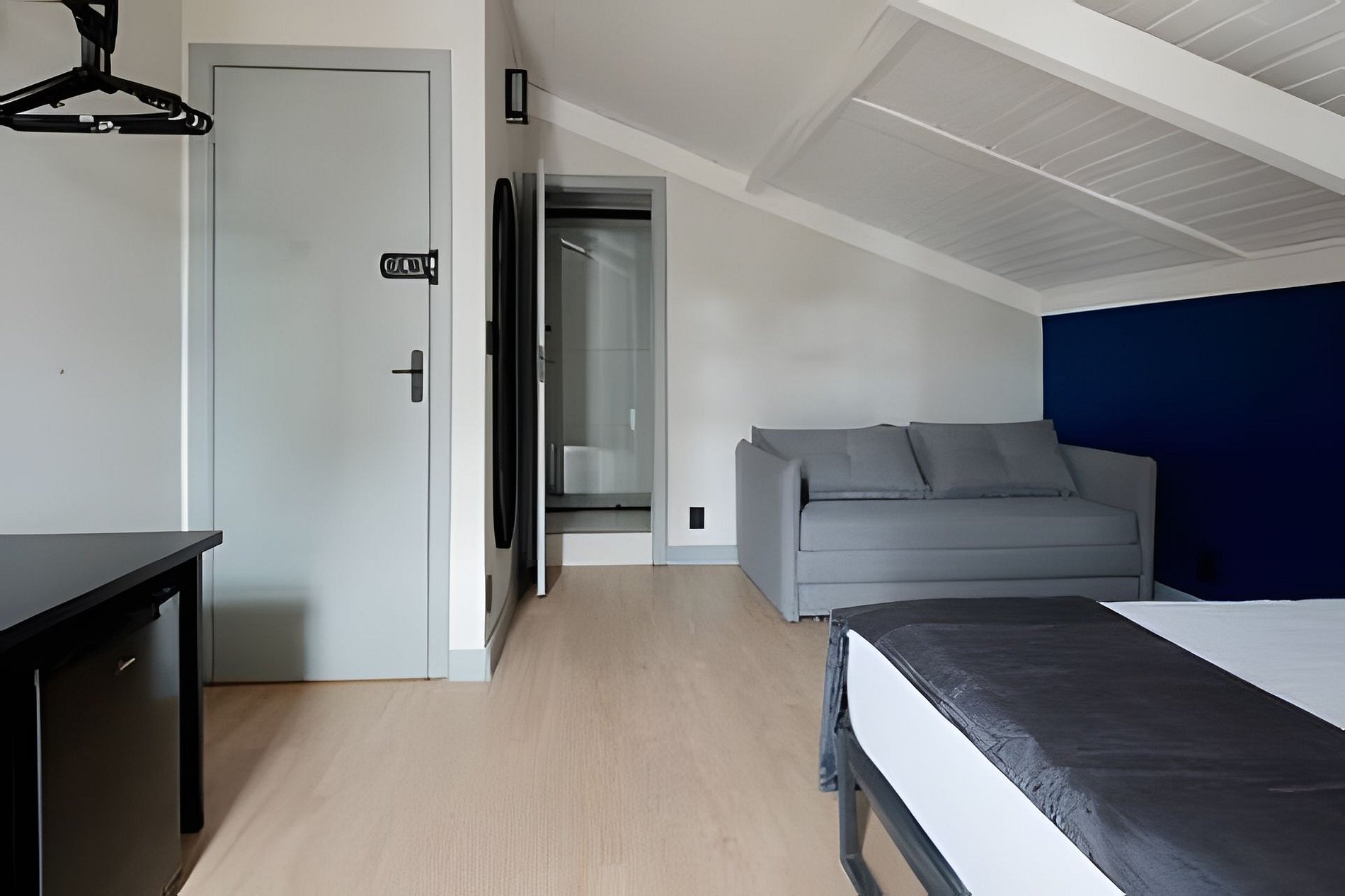 O Flat possui uma cama Queen e sofá-cama (o enxoval para o sofá-cama é disponibilizado a partir do 3º hóspede), ar condicionado, TV Smart, mesa exclusiva para trabalho e frigobar.