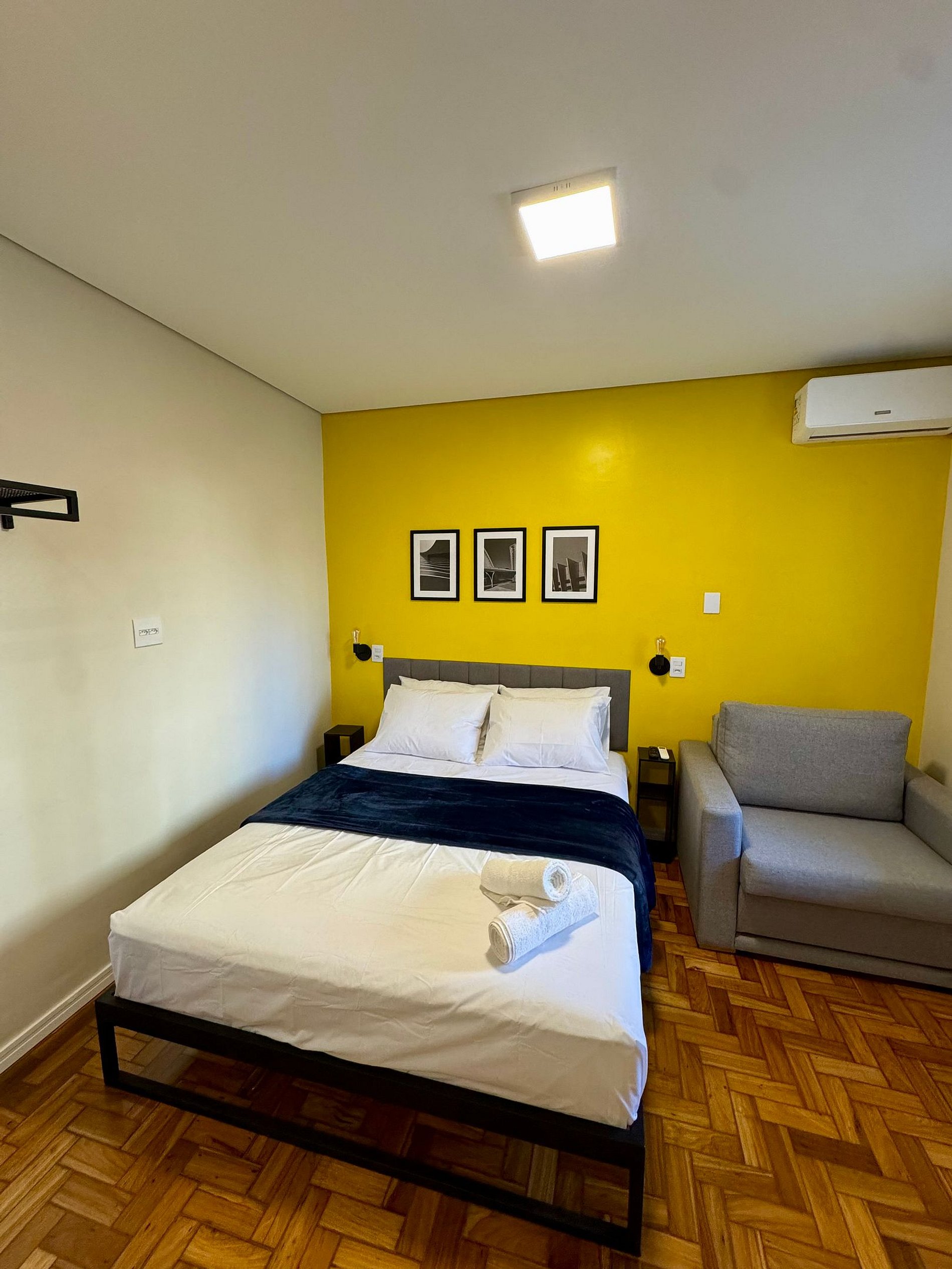 O Flat possui uma cama Queen e um sofá-cama (o enxoval para o sofá-cama é disponibilizado a partir do 3º hóspede), ar condicionado, TV Smart e uma cozinha compacta com itens básicos para preparo de pequenas refeições como café da manhã.
