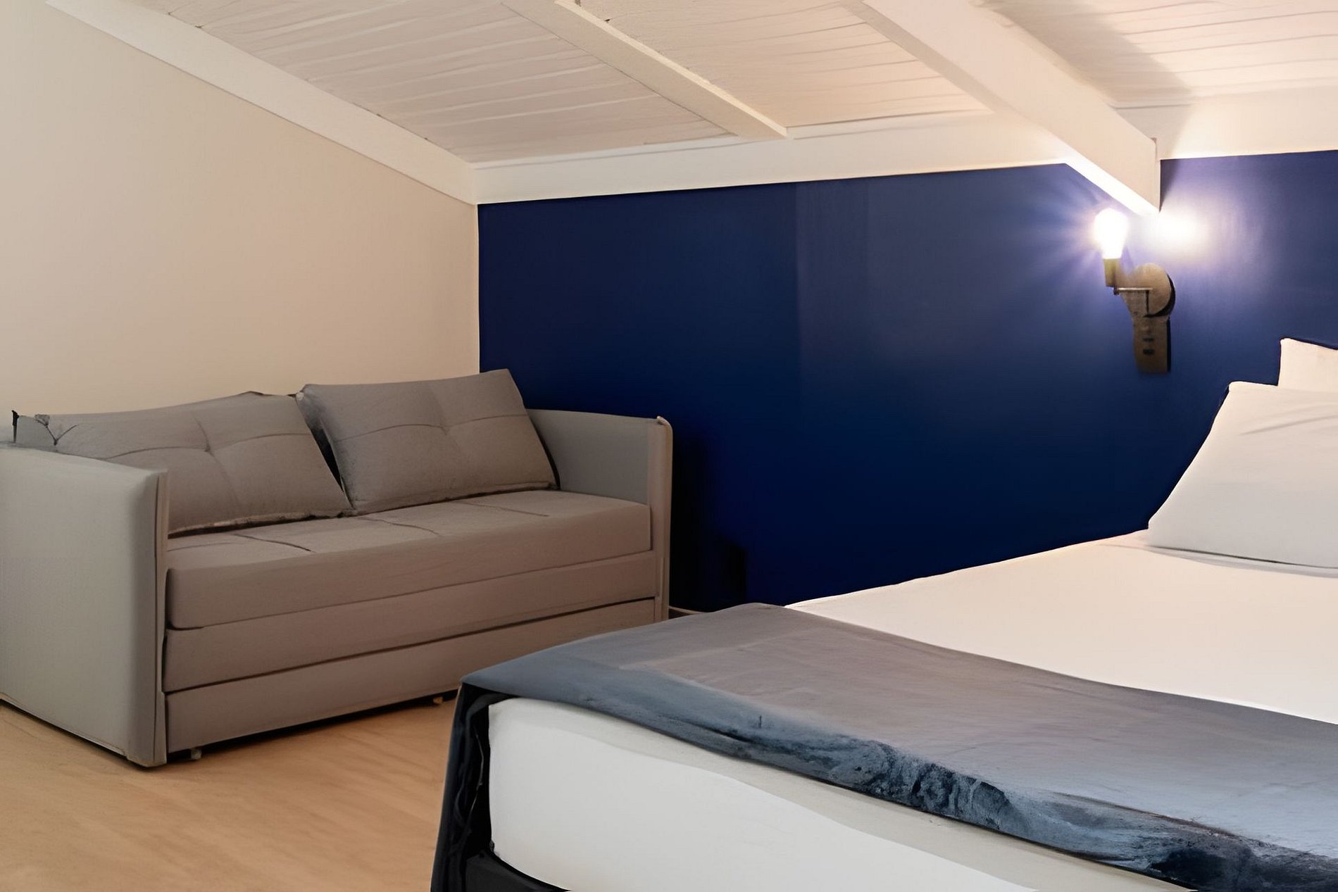 O Flat possui uma cama Queen e sofá-cama (o enxoval para o sofá-cama é disponibilizado a partir do 3º hóspede), ar condicionado, TV Smart, mesa exclusiva para trabalho e frigobar.