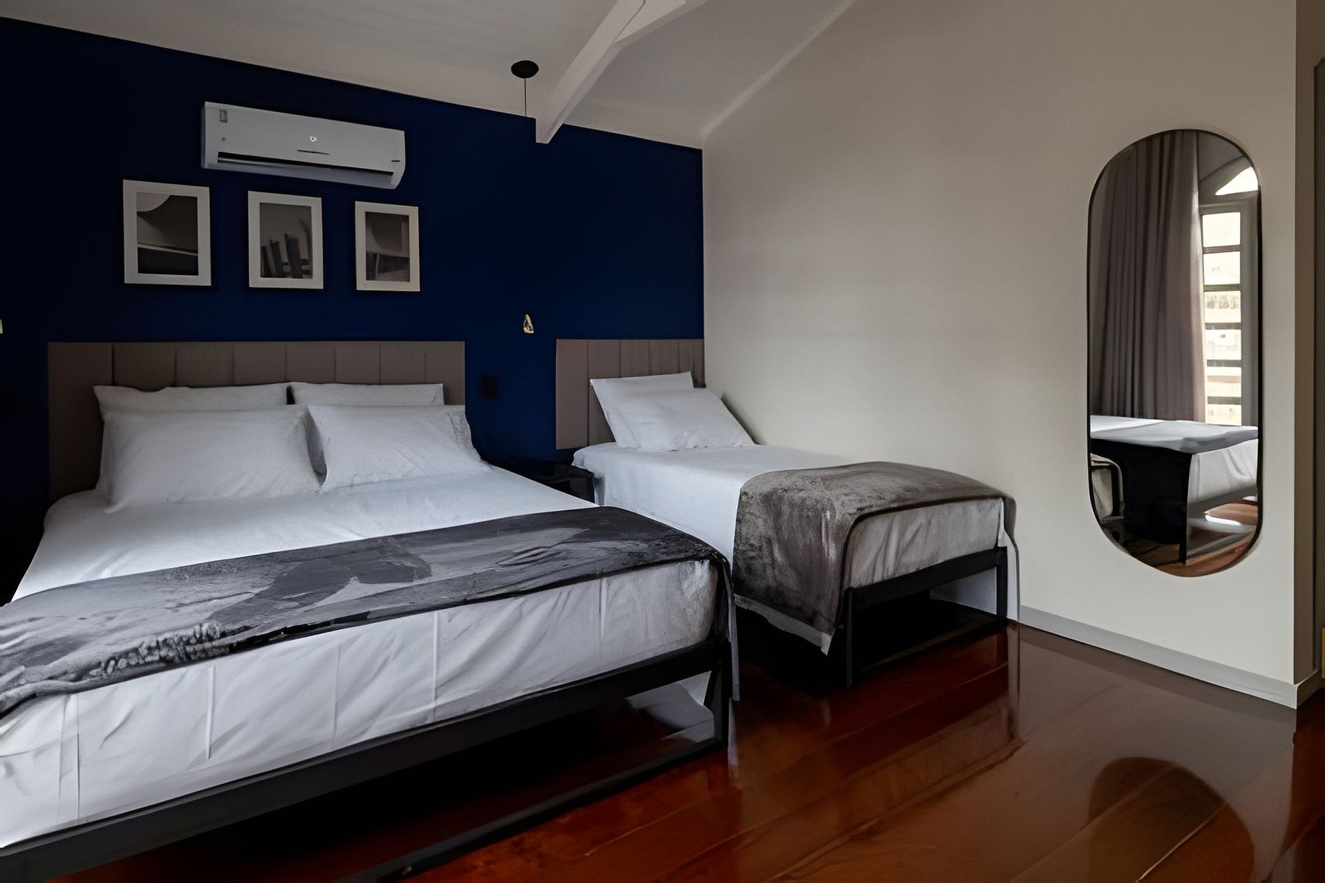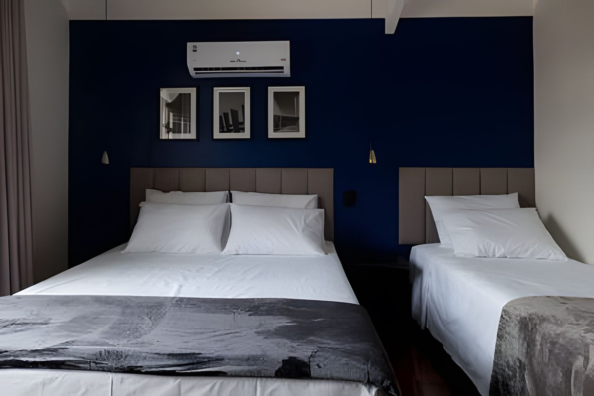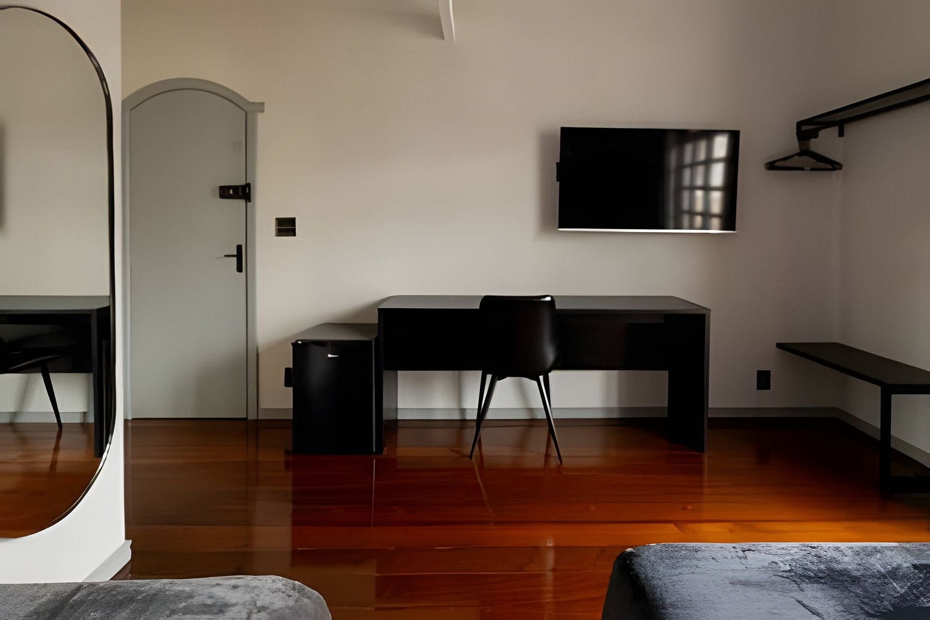 O Flat possui uma cama Queen e uma cama de solteiro, ar condicionado, TV Smart, mesa exclusiva para trabalho e frigobar.