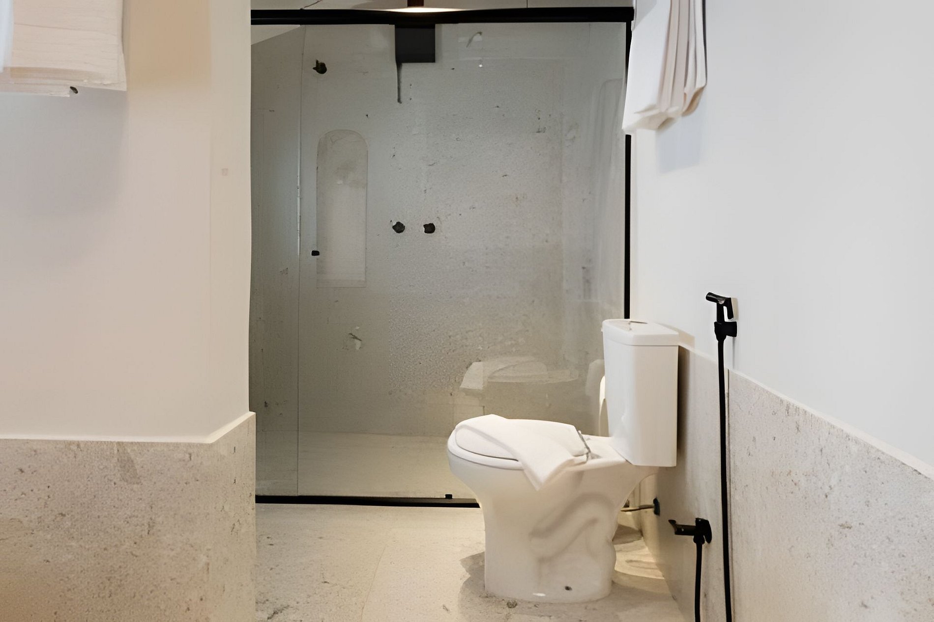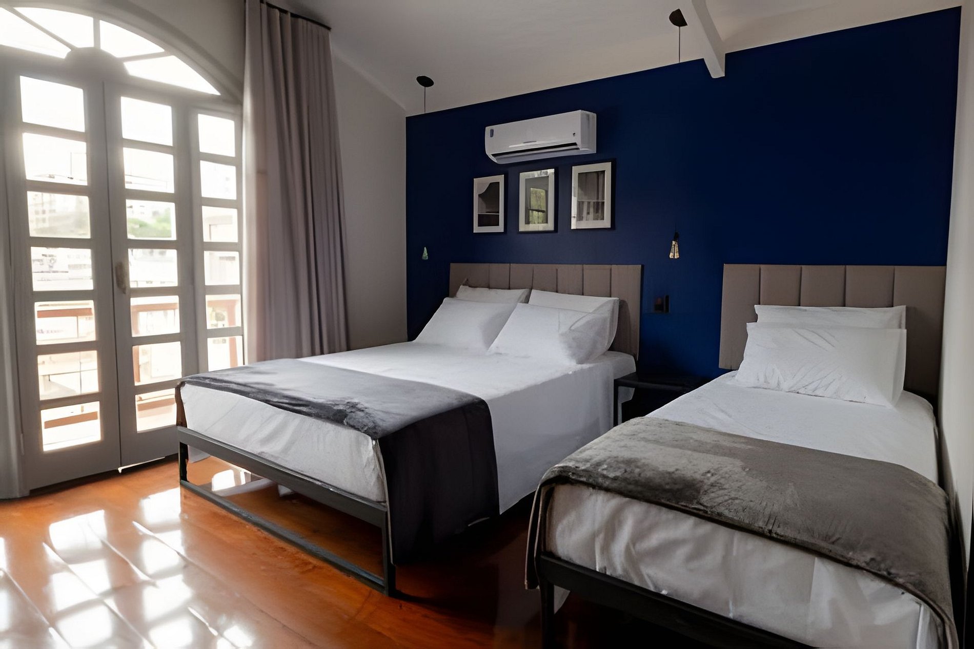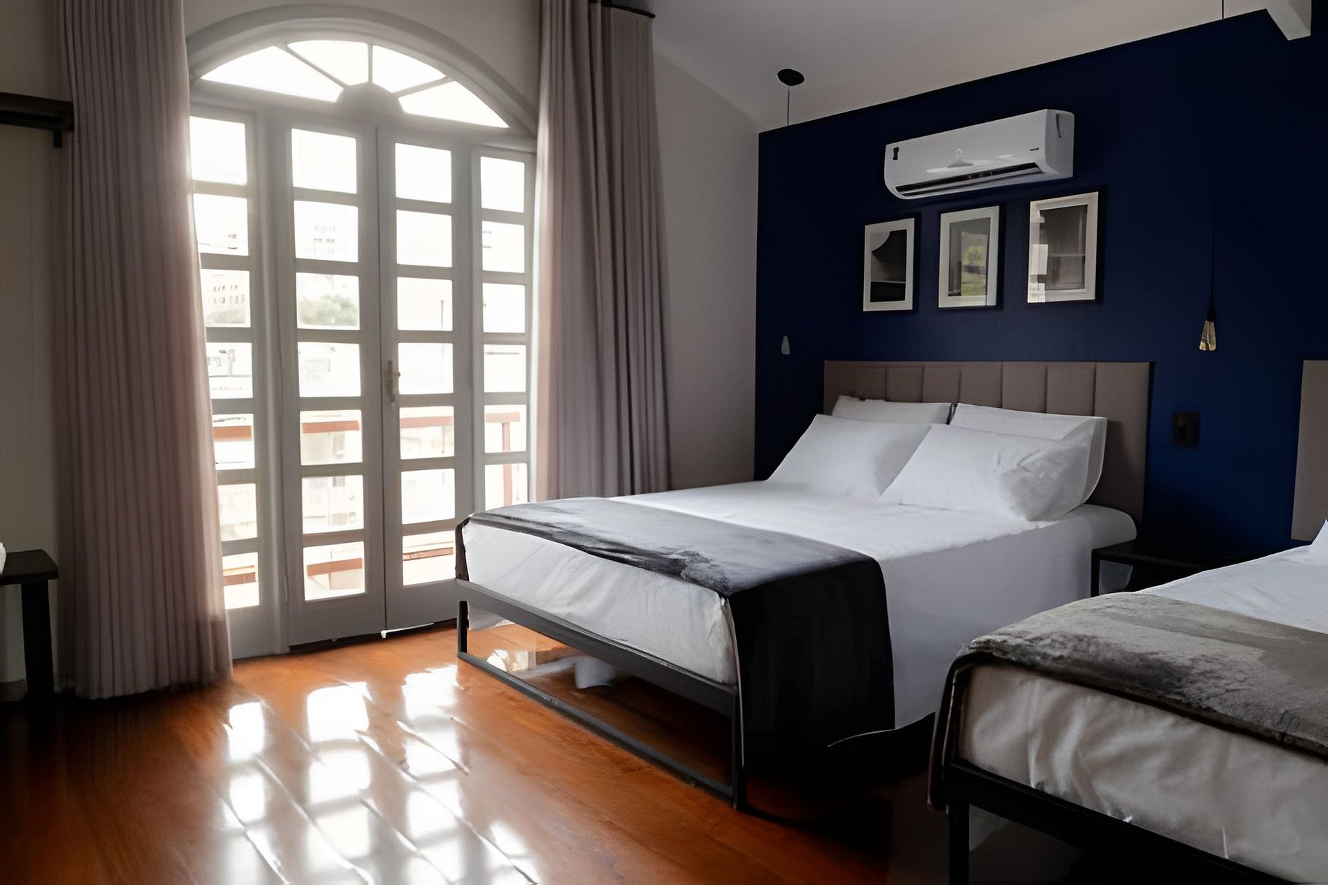 O Flat possui uma cama Queen e uma cama de solteiro, ar condicionado, TV Smart, mesa exclusiva para trabalho e frigobar.
