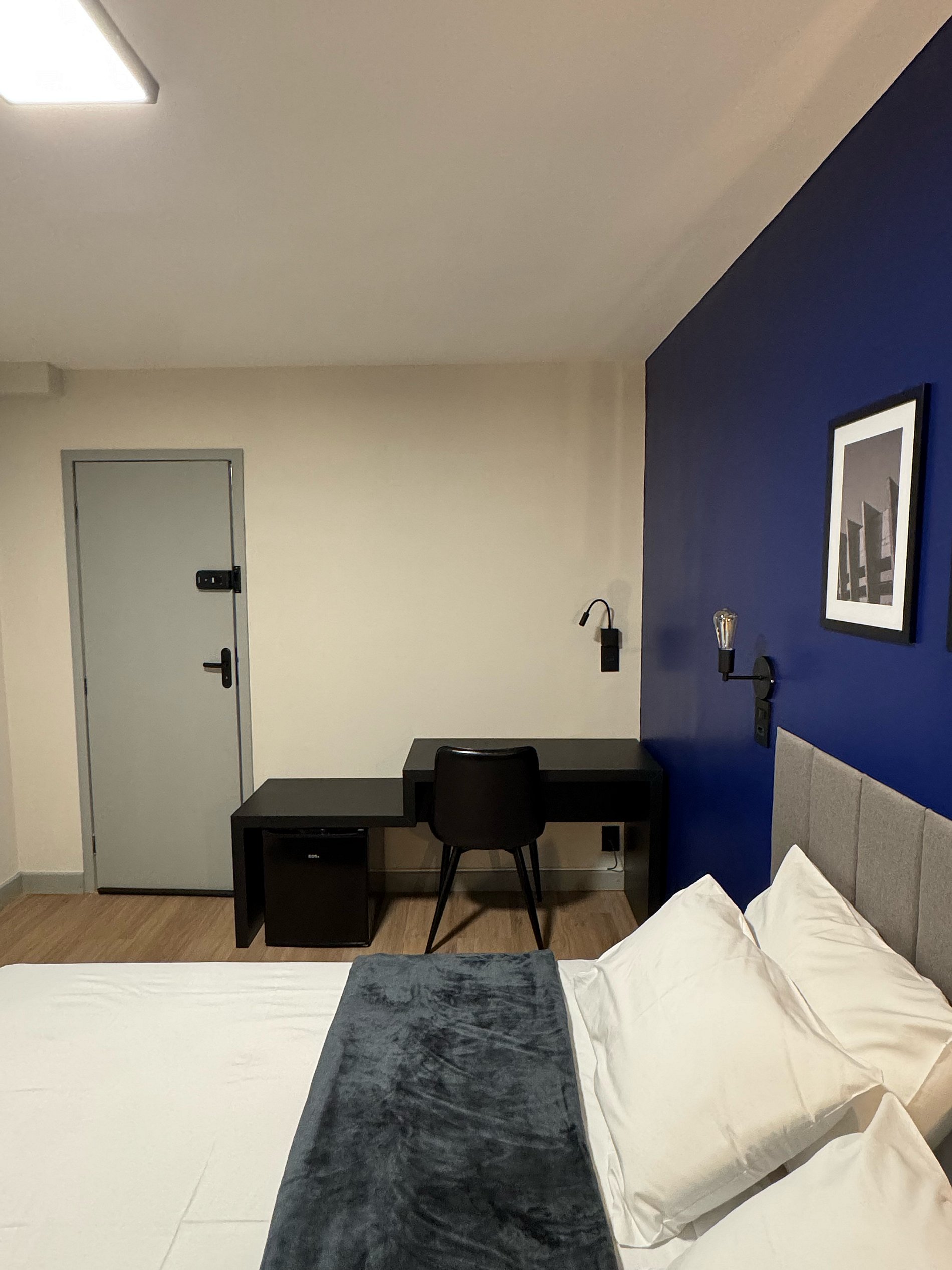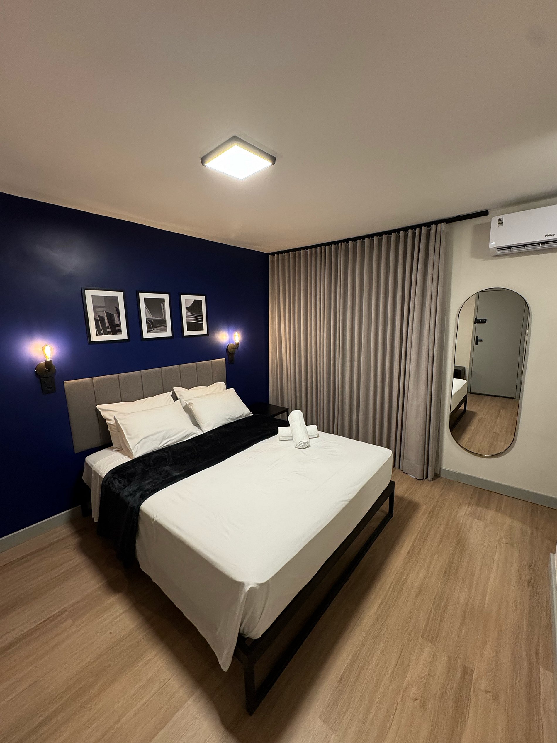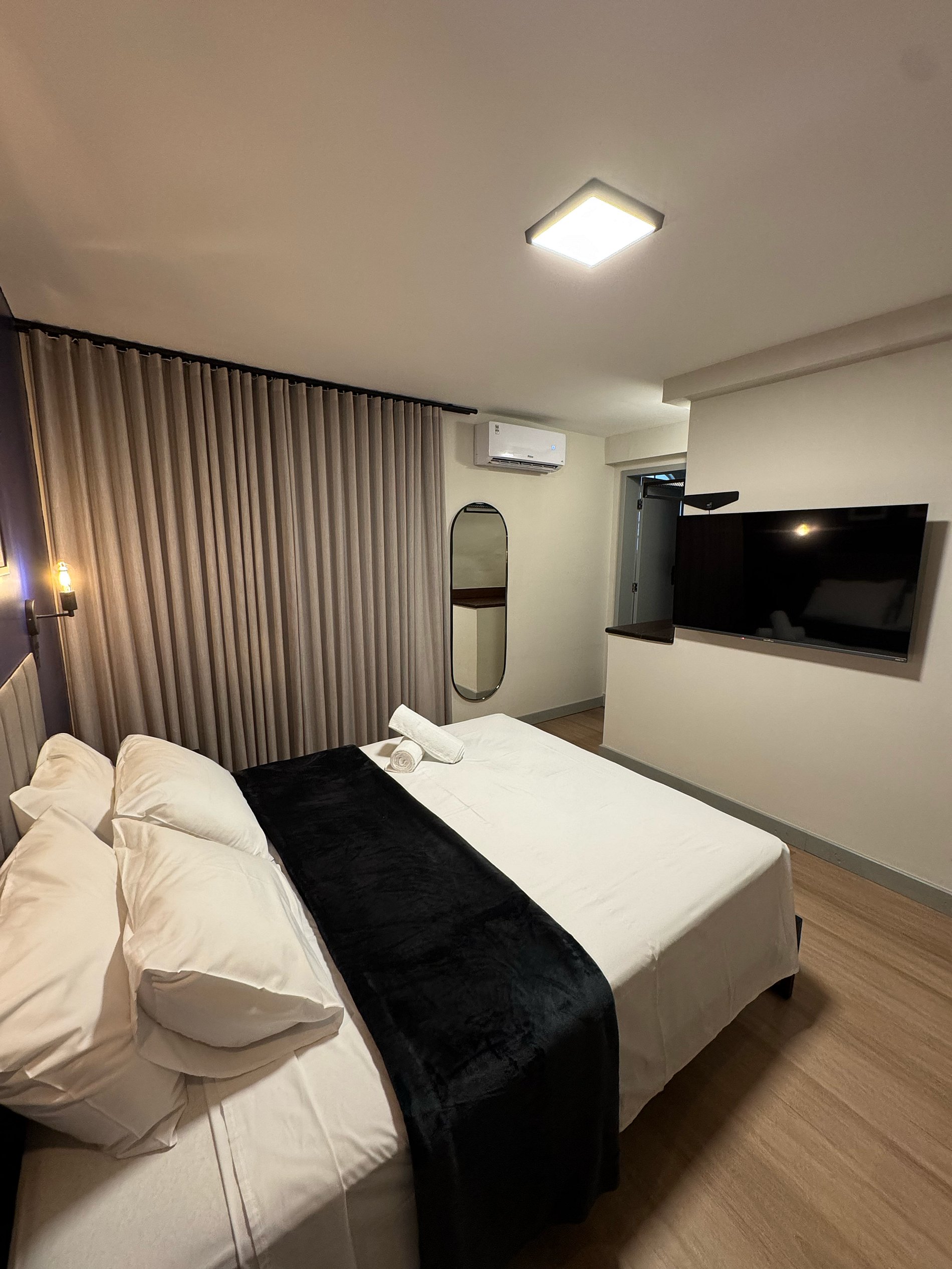 O Flat possui uma cama Queen, TV Smart, mesa exclusiva para trabalho e frigobar.