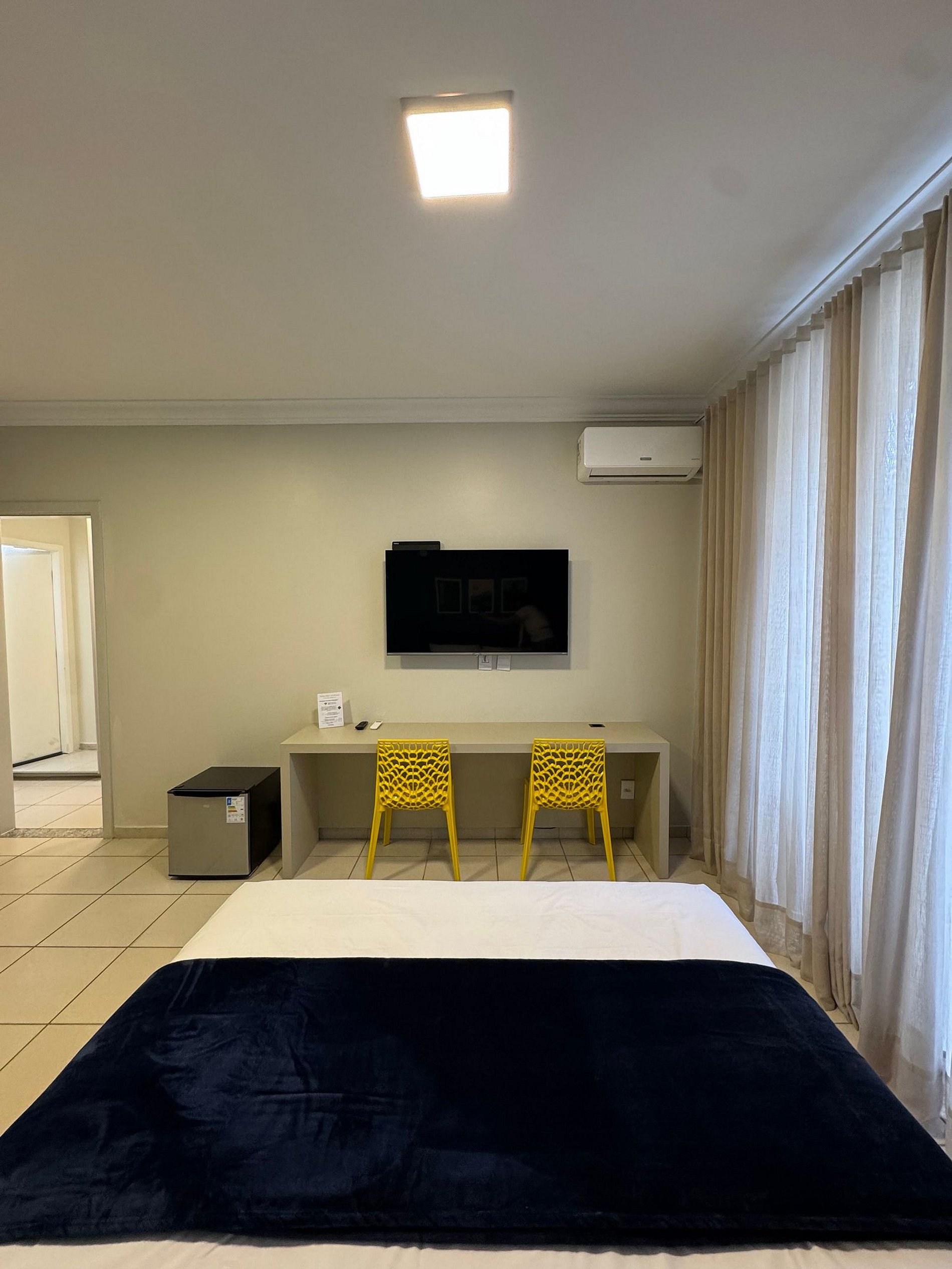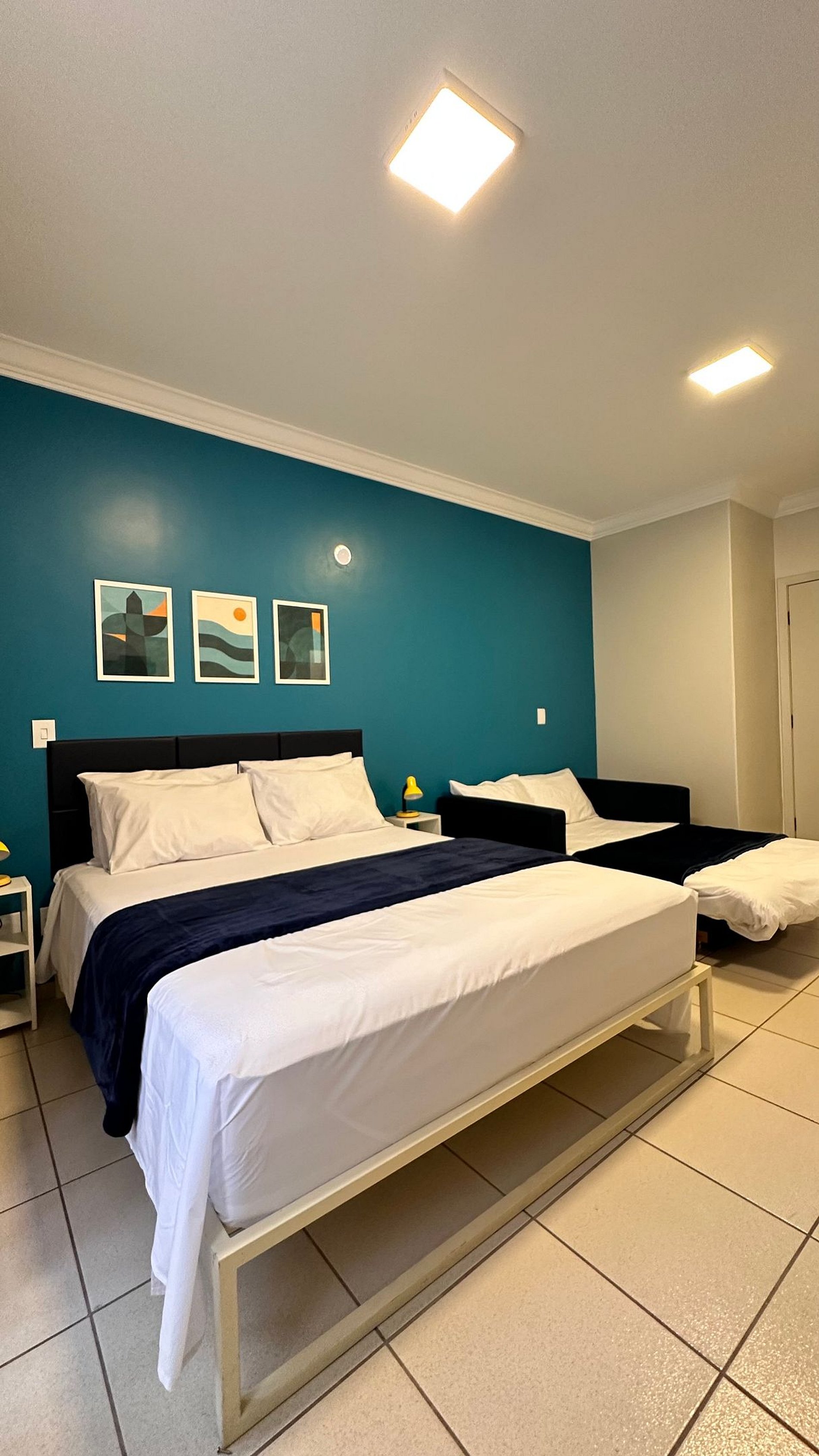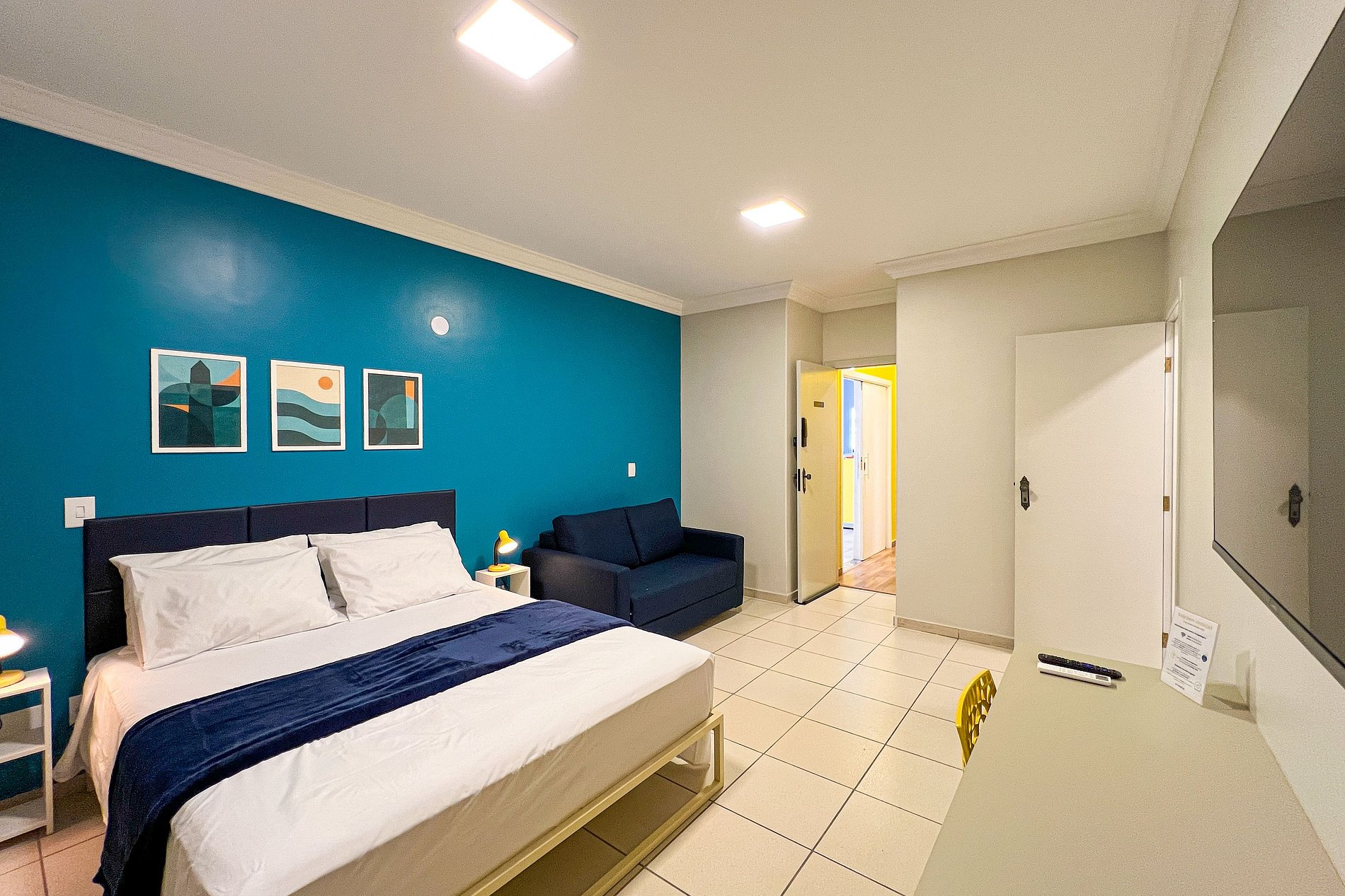 O Flat possui uma cama Queen e um sofá-cama (o enxoval para o sofá-cama é disponibilizado a partir do 3º hóspede), ar condicionado, TV Smart, mesa exclusiva para trabalho e frigobar.